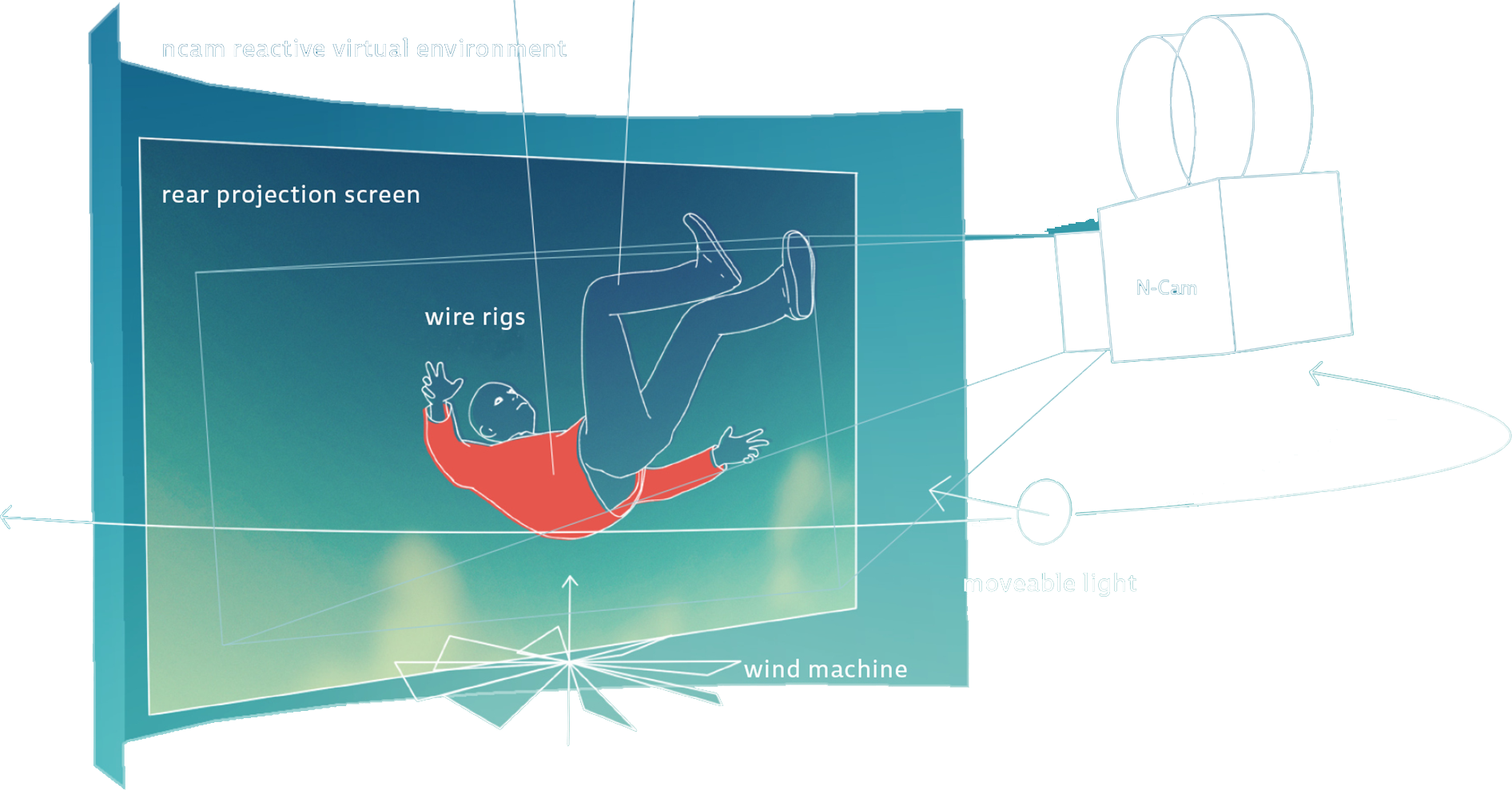 A major problem to overcome with back-projection is the missing parallax in case of a moving camera: If you move the camera along a projection screen, you quickly see that the background is a fixed projection screen instead of a three dimensional world. This was amplified by the large distance between the foreground actors and the sky background we had.